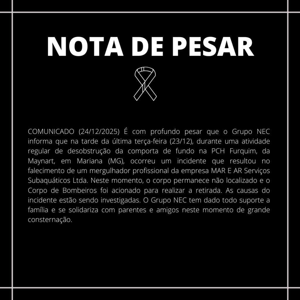 É com profundo pesar que o Grupo NEC informa que na tarde da última terça-feira (23/12), durante uma atividade regular de desobstrução da comporta de fundo na PCH Furquim, da Maynart, em Mariana (MG), ocorreu um incidente que resultou no falecimento de um mergulhador profissional da empresa MAR E AR Serviços Subaquáticos Ltda. Neste momento, o corpo permanece não localizado e o Corpo de Bombeiros foi acionado para realizar a retirada. As causas do incidente estão sendo investigadas. O Grupo NEC tem dado todo suporte a família e se solidariza com parentes e amigos neste momento de grande consternação.