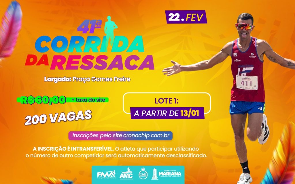 No próximo dia 22 de fevereiro, acontece a 41ª edição da tradicional Corrida da Ressaca. Organizada pela Prefeitura de Mariana, através da Secretaria de Esportes, Comunicação e Eventos, a competição terá cerca de 600 atletas participantes.