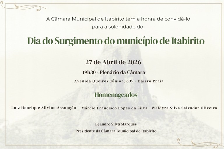 A Câmara Municipal de Itabirito, na região central de Minas Gerais, prepara-se para uma Sessão Solene especial na próxima segunda-feira, 27 de abril. Com início previsto para as 19h30, no Plenário da Casa Legislativa, o evento tem como objetivo celebrar o Dia do Surgimento do Município, reforçando os laços históricos e a identidade local. A cerimônia será aberta ao público, convidando a comunidade a participar de um momento cívico importante.