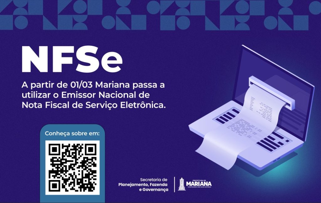 A Prefeitura de Mariana, por meio da Secretaria de Planejamento, Fazenda e Governança, passa a adotar o Emissor Nacional de Nota Fiscal de Serviços Eletrônica (NFS-e) a partir do dia 1° de março. A mudança integra a cidade ao sistema padronizado em nível nacional, promovendo mais modernização, segurança e integração tributária.