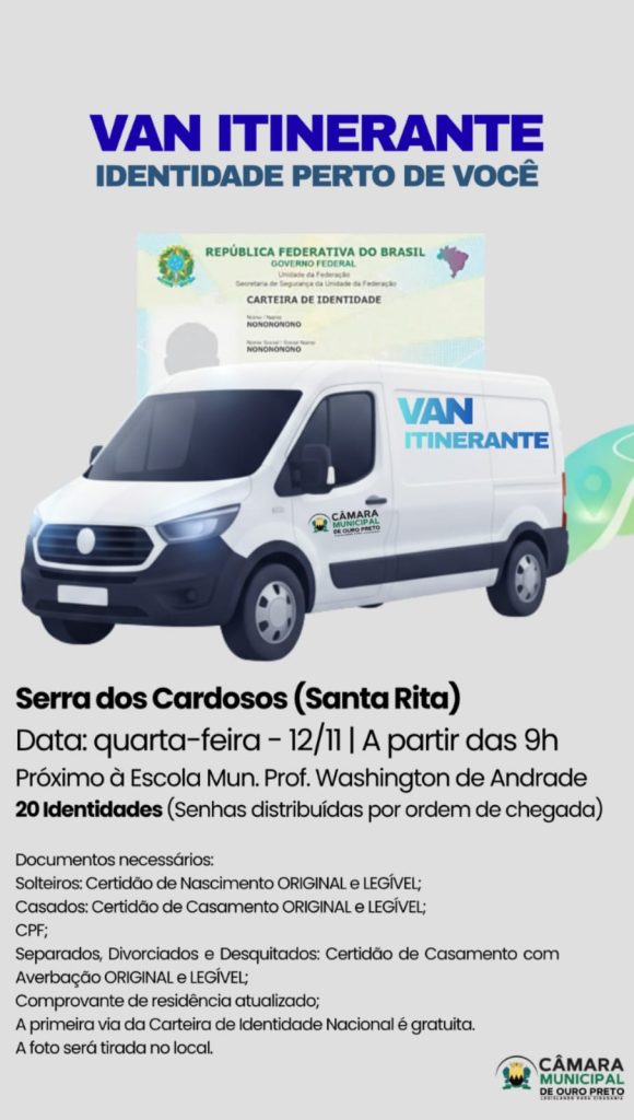 A próxima parada da Van Itinerante já está definida: a comunidade de Serra dos Cardosos (Santa Rita). Os moradores da região terão a oportunidade de utilizar os serviços da van nesta quarta-feira, 5 de novembro. A ação representa um passo importante para garantir a cidadania e o acesso a serviços essenciais para todos os habitantes de Ouro Preto.
